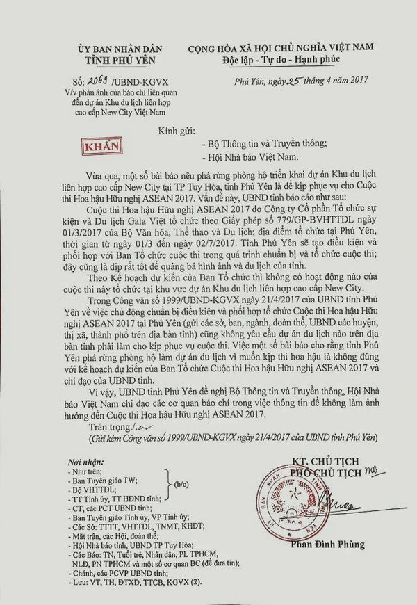 Liên quan đến dự án trên, cuối giờ chiều 25-4, UBND tỉnh Phú Yên có công văn hỏa tốc gửi các cơ quan liên quan và báo chí. Công văn do ông Phan Đình Phùng, Phó Chủ tịch UBND tỉnh, ký nêu: Vừa qua một số bài báo nêu phá rừng phòng hộ triển khai dự án khu du lịch liên hợp cao cấp New City là để kịp phục vụ cho cuộc thi hoa hậu Hữu nghị ASEAN 2007.