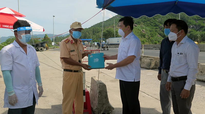 Ông Trần Hữu Thế, Chủ tịch UBND tỉnh Phú Yên (thứ ba từ trái sang) trao điện thoại cho một chốt kiểm soát ở thị xã Đông Hòa. Ảnh: XUÂN TRIỆU