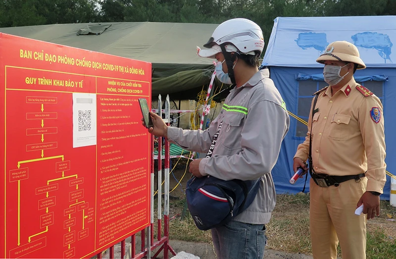 Ghi nhận tại một số chốt kiểm soát dịch COVID-19 trên quốc lộ 1 và quốc lộ 29 đoạn qua thị xã Đông Hòa cho thấy tại các chốt kiểm soát này đều được dán QR Code, hướng dẫn sử dụng các ứng dụng quét mã khai báo y tế như Bluezone, tokhaiyte.vn…