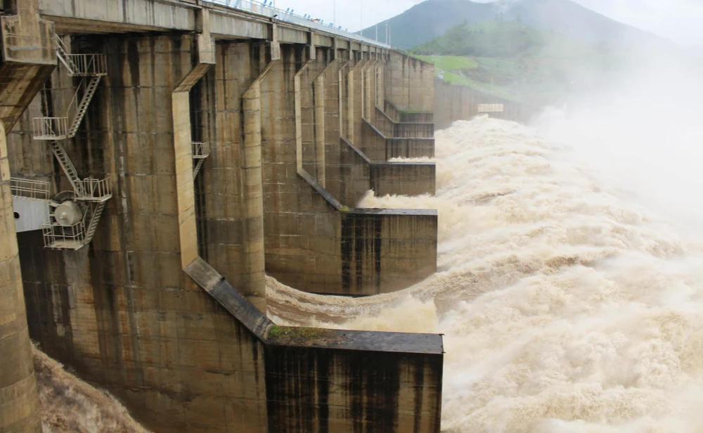 Thủy điện Sông Ba Hạ liên tục tăng lưu lượng xả lũ. Ảnh: TẤN LỘC