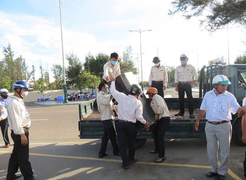 Lực lượng chức năng thu giữ các loa kẹo kéo trên bãi biển Tuy Hòa. Ảnh: TL