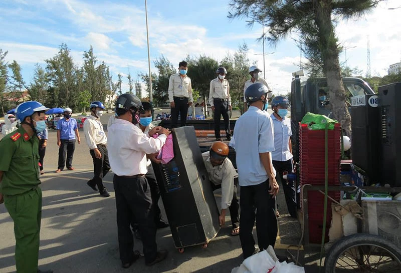 Các lực lượng chức năng TP Tuy Hòa xử lý các trường hợp kinh doanh cho thuê loa kẹo kéo vi phạm. Ảnh: TL