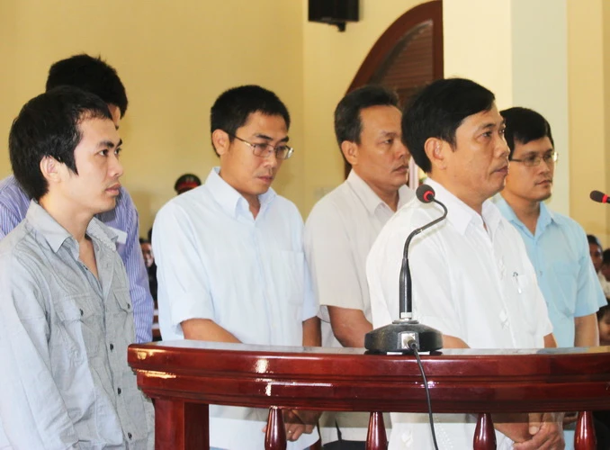 Sáu bị cáo cựu sĩ quan công an tại phiên tòa sơ thẩm. Ảnh: TẤN LỘC