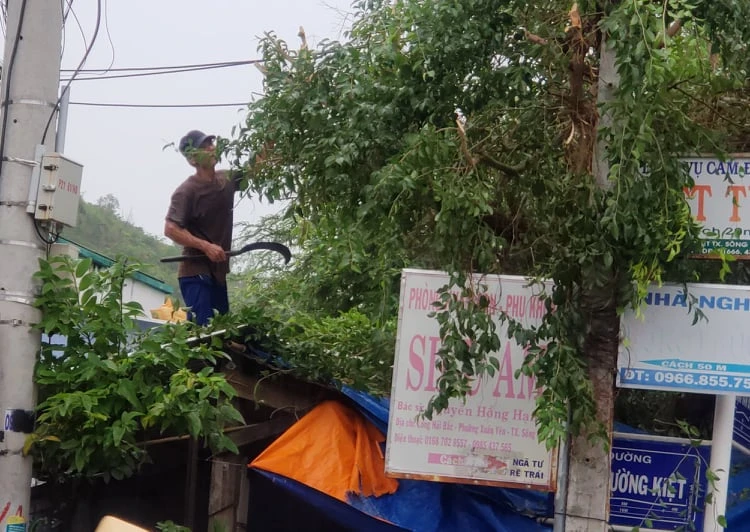 Người dân cắt tỉa cây xanh, gia cố nhà cửa. Ảnh: TS