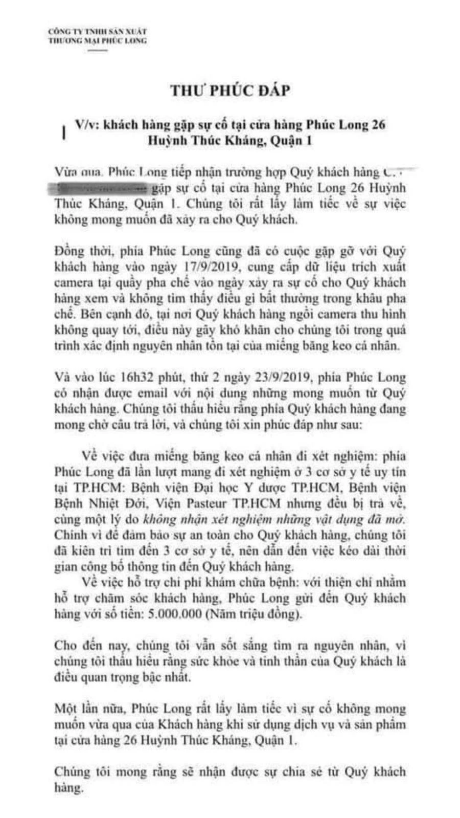 Theo mail này, Phúc Long không lên tiếng khẳng định hay phủ định sự việc cũng như phản hồi lại thông tin khách hàng (người uống phải ly trà vải có băng keo cá nhân đã qua sử dụng - PV), được đăng tải trong thời gian gần đây.