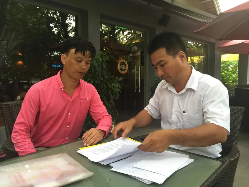 Hoàng Văn Tính (trái) đang nghe luật sư Hoàng Cao Sang hướng dẫn các thủ tục pháp lý để kêu oan và tố cáo người có hành vi dùng nhục hình đối với Tính ở công an phường