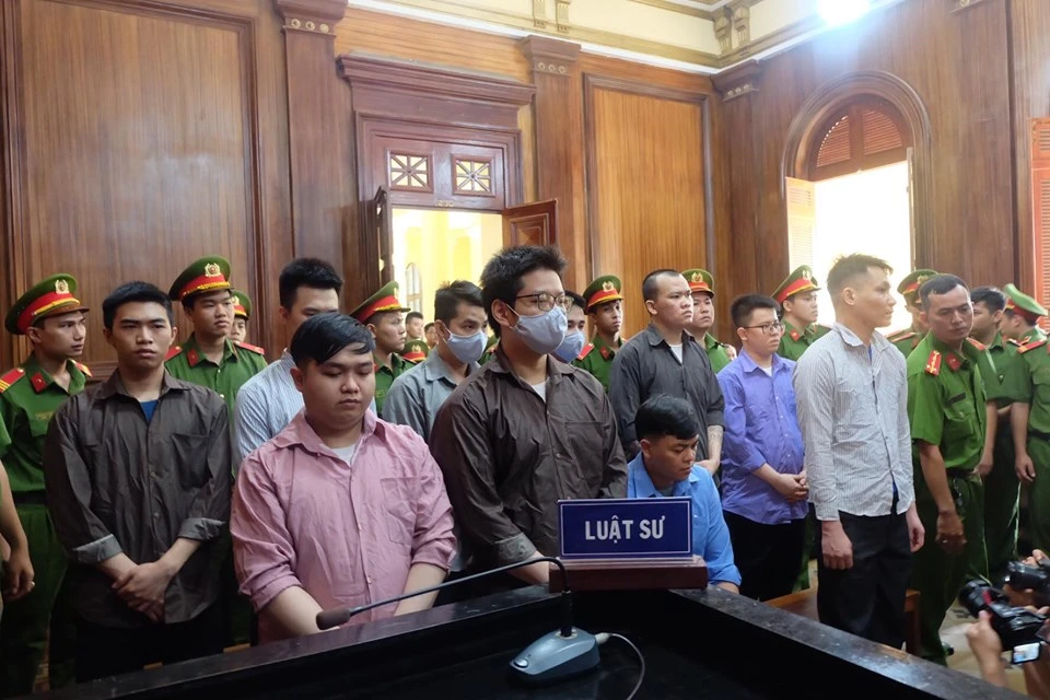 Các bị cáo tại phiên xử, Phúc XO được cho ngồi do chân yếu. Ảnh: HOÀNG YẾN
