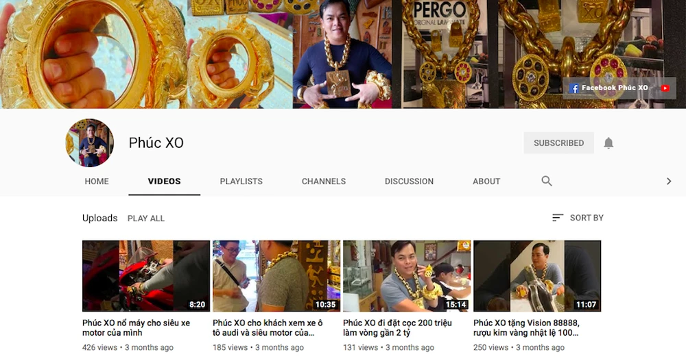 Phúc XO nổi tiếng với việc đeo 17kg vàng, sở hữu ôtô, xe máy mạ vàng mang biển số tứ quý ngũ quý… Anh cũng từng xuất hiện trên nhiều trang thông tin khi đeo rất nhiều vàng cùng dàn vệ sĩ đi theo bảo vệ trên phố đi bộ Nguyễn Huệ (TP.HCM) để theo dõi trận đấu giữa đội tuyển Việt Nam và Philippines.