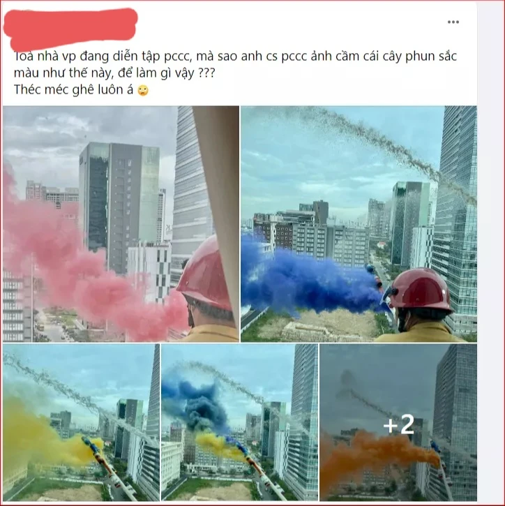 Cụ thể, một người dân chia sẻ rằng toà nhà văn phòng nơi chị đang làm việc có diễn tập phòng cháy chữa cháy (PCCC). Điều chị thắc mắc là sao anh cảnh sát PCCC cầm cái cây phun sắc màu như thế này, để làm gì vậy?