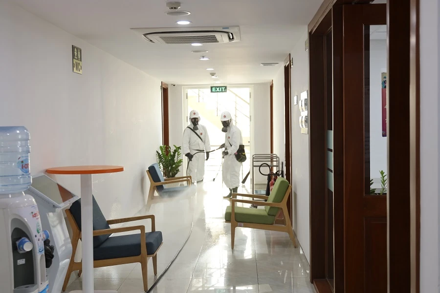 Khoảng 4.000 m2 gồm sảnh toà nhà, khu vực để xe khách, hầm để xe nhân viên, các lối đi lên tầng 5, 6, thang máy, các phòng làm việc, khu vực phục vụ sự kiện của Trung tâm đều được phun khử khuẩn.