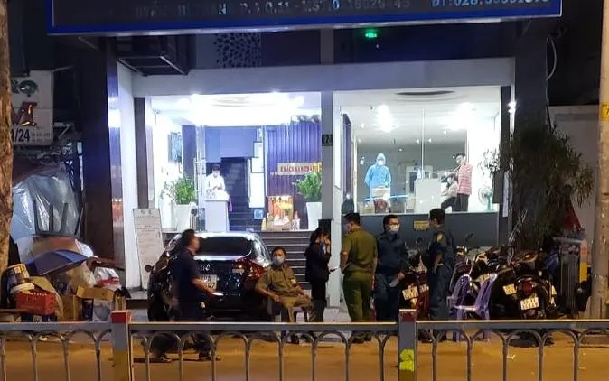 Ghi nhận vào lúc 22 giờ 10 ngày 28-7, một xe cấp cứu đậu trước khách sạn này, sau đó nhân viên y tế mặc đồ bảo hộ đi vào trong và tiến hành phun thuốc nhiều khu vực.