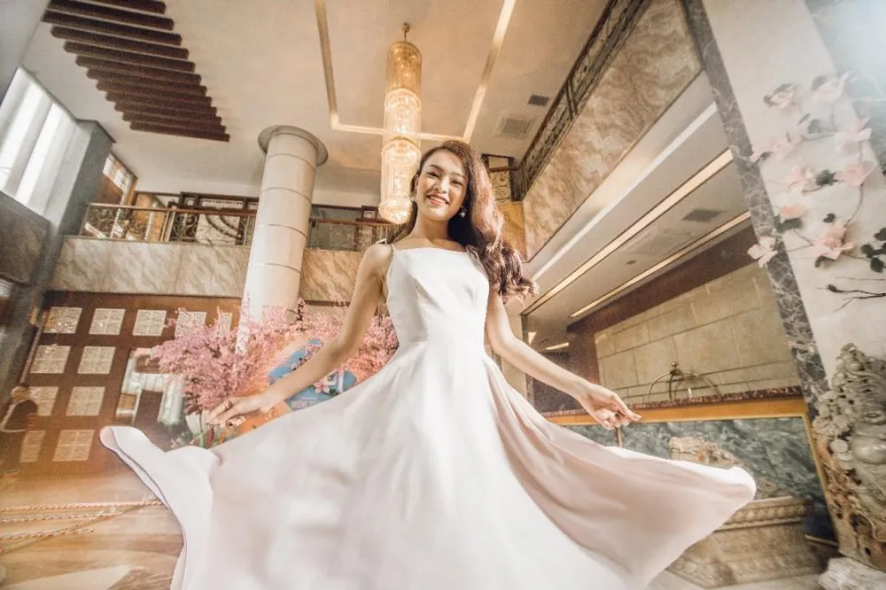 Người đẹp diện một chiếc váy bồng bềnh, tạo dáng như công chúa đi thăm khách sạn.