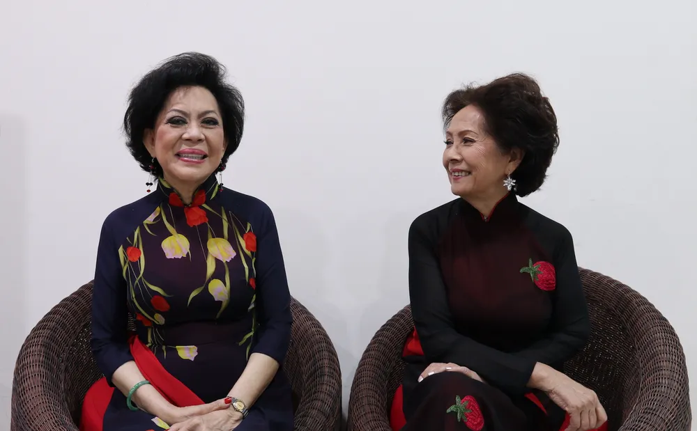 Ca sĩ Giao Linh (trái) và ca sĩ Phương Dung trong buổi trò chuyện cùngPháp Luật TP.HCM.