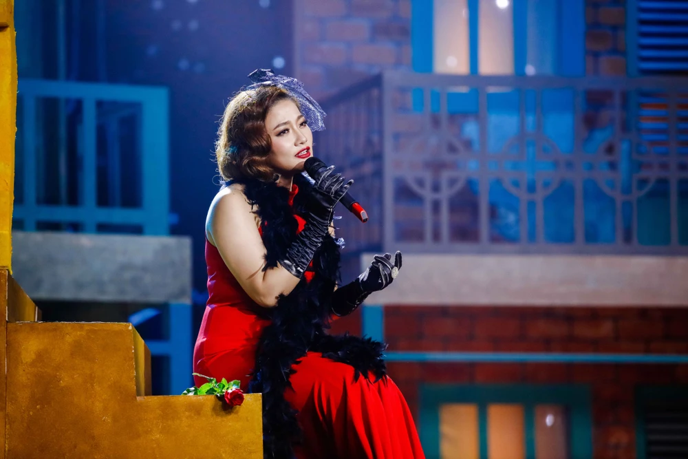 Thu Trang thể hiện ca khúc Buồn trong kỷ niệm mở màn đêm nhạc Trúc Phương.