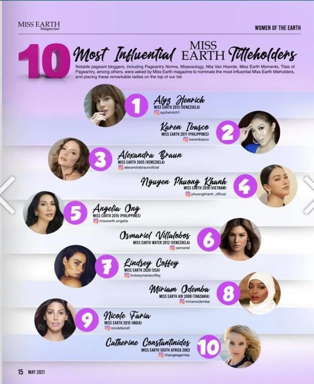 Ngày 31-5, tổ chức Miss Earth công bố danh sách 10 Hoa hậu Trái Đất có tầm ảnh hưởng nhất lịch sử.