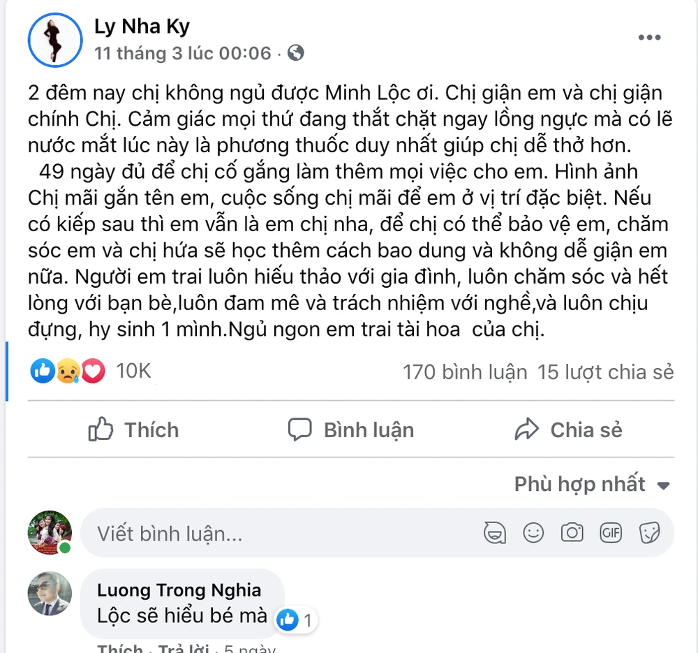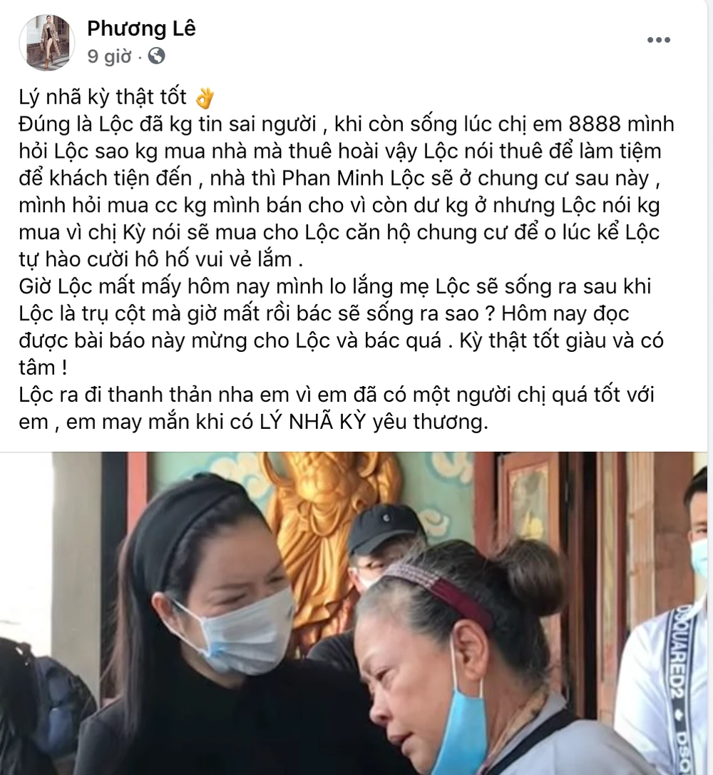 Ngày hay tin Minh Lộc mất, Phương Lê lo lắng mẹ anh sẽ sống ra sao khi trụ cột gia đình đã mất. “Hôm nay đọc được bài báo này mừng cho Lộc và bác quá . Kỳ thật tốt giàu và có tâm! Lộc ra đi thanh thản nha em vì em đã có một người chị quá tốt với em , em may mắn khi có Lý Nhã Kỳ yêu thương”, Phương Lê viết.