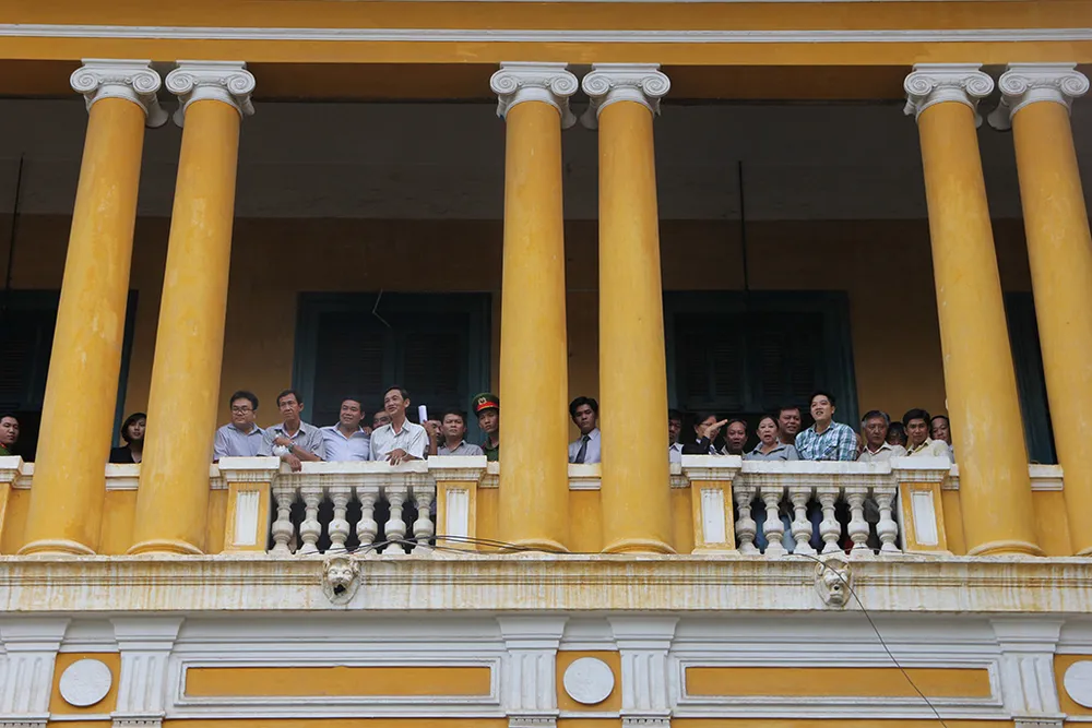 Mọi người đứng trên lầu của TAND TP xem Phương Nga được tại ngoại.
