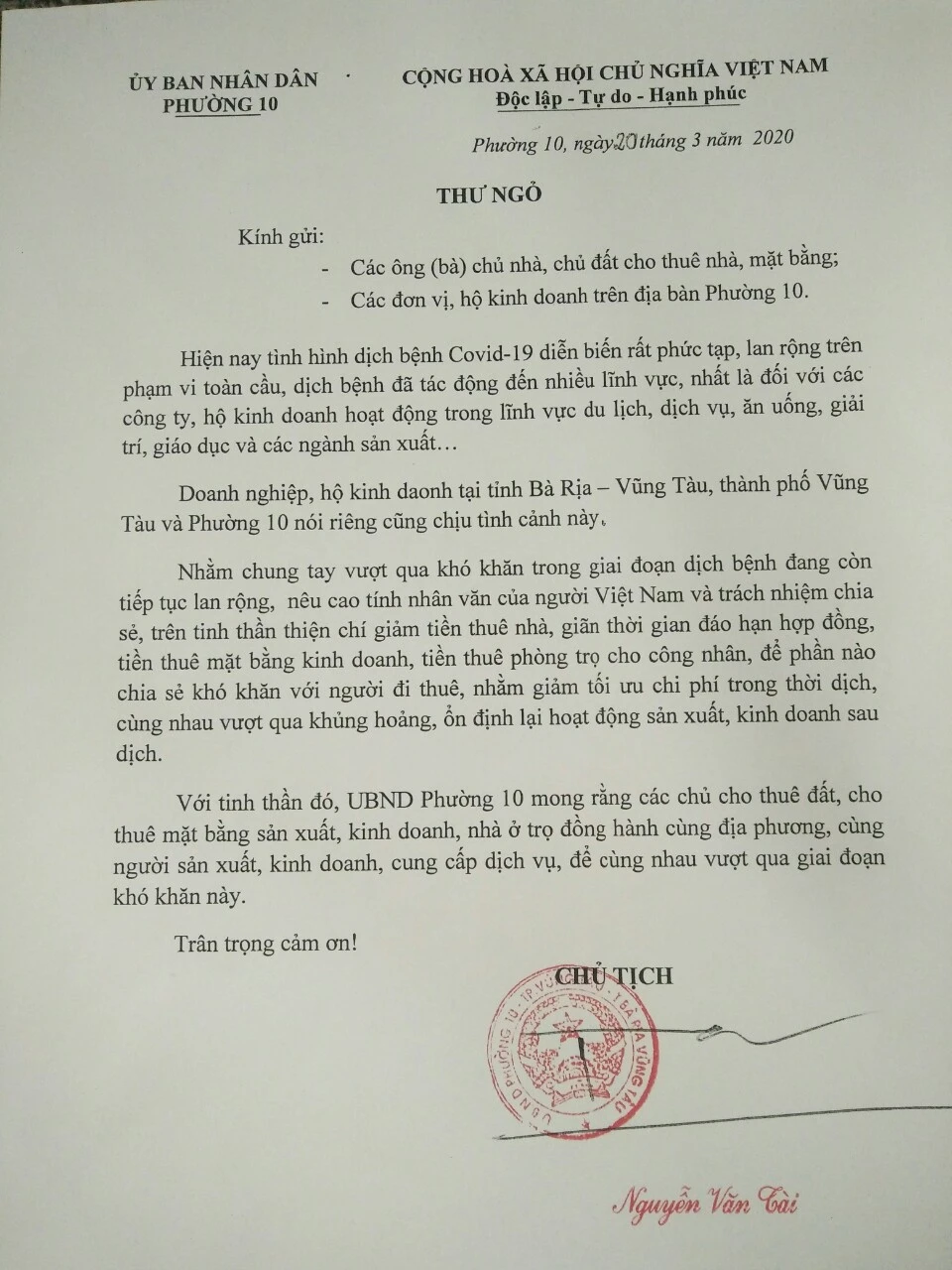 Thư ngỏ của chủ tịch UBND phường 10, TP Vũng Tàu. Ảnh: TRÙNG KHÁNH
