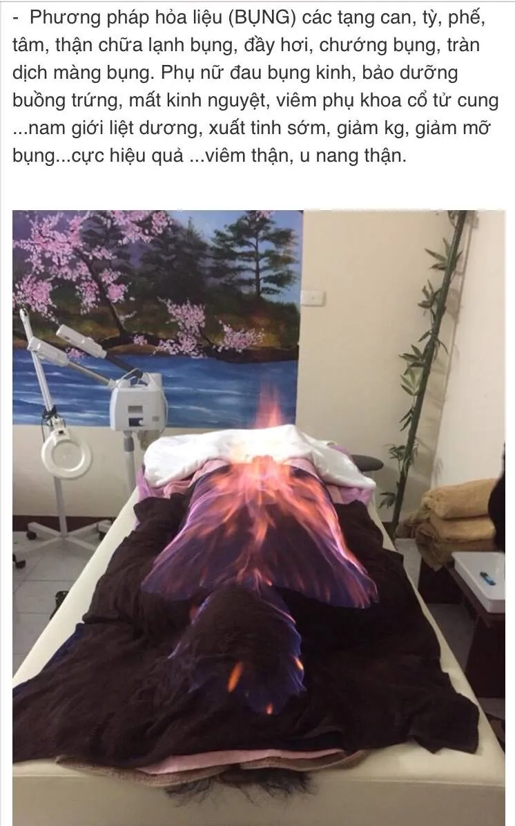 Mới đây, trên các phương tiện thông tin đại chúng lan truyền video clip trị liệu bằng lửa. Theo đó, một người nằm trên giường ở một cơ sở spa được trùm mấy lớp khăn và được nhân viên spa tưới cồn đốt lửa cháy phừng phực.