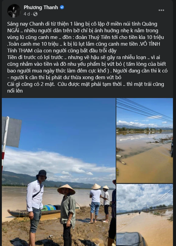 Ca sĩ Phương Thanh bị phản ứng dữ dội, vì thật ra nơi cô đến là Quảng Nam. Chưa hết, bài đăng này còn gây bức xúc vì Phương Thanh cho rằng "nhiều người dân trên bờ chỉ bị ảnh huởng nhẹ không nằm trong vùng lũ cũng canh me, đồn đoàn Thủy Tiên tới cho tiền 10 triệu".