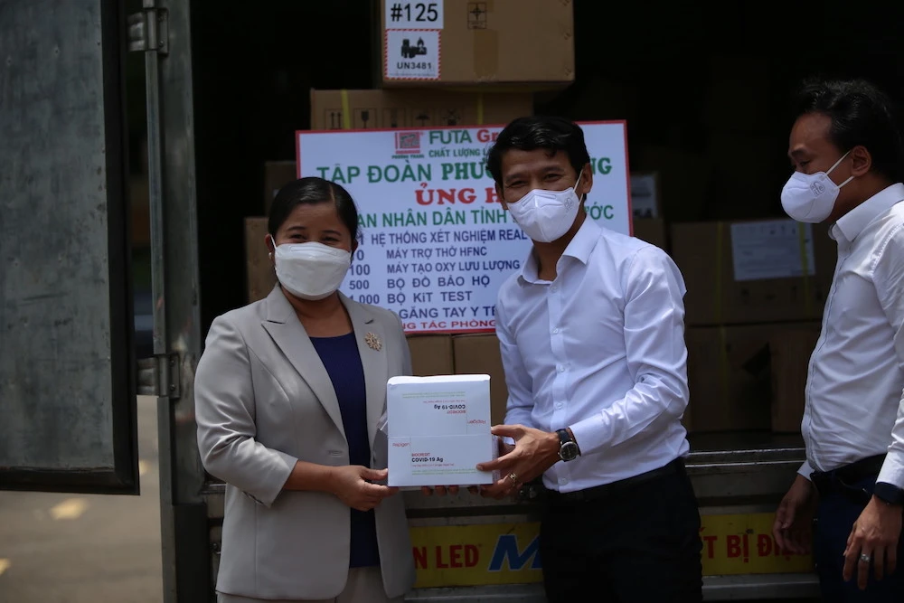 Tại buổi tiếp nhận, ông Đào Viết Ánh đã trao tặng một hệ thống xét nghiệm REAL TIME - PCR; 10 máy trợ thở HFNC; 100 máy tạo oxy lưu lượng cao; 1.000 bộ kit test nhanh; 500 bộ đồ bảo hộ và 100 ngàn găng tay y tế.