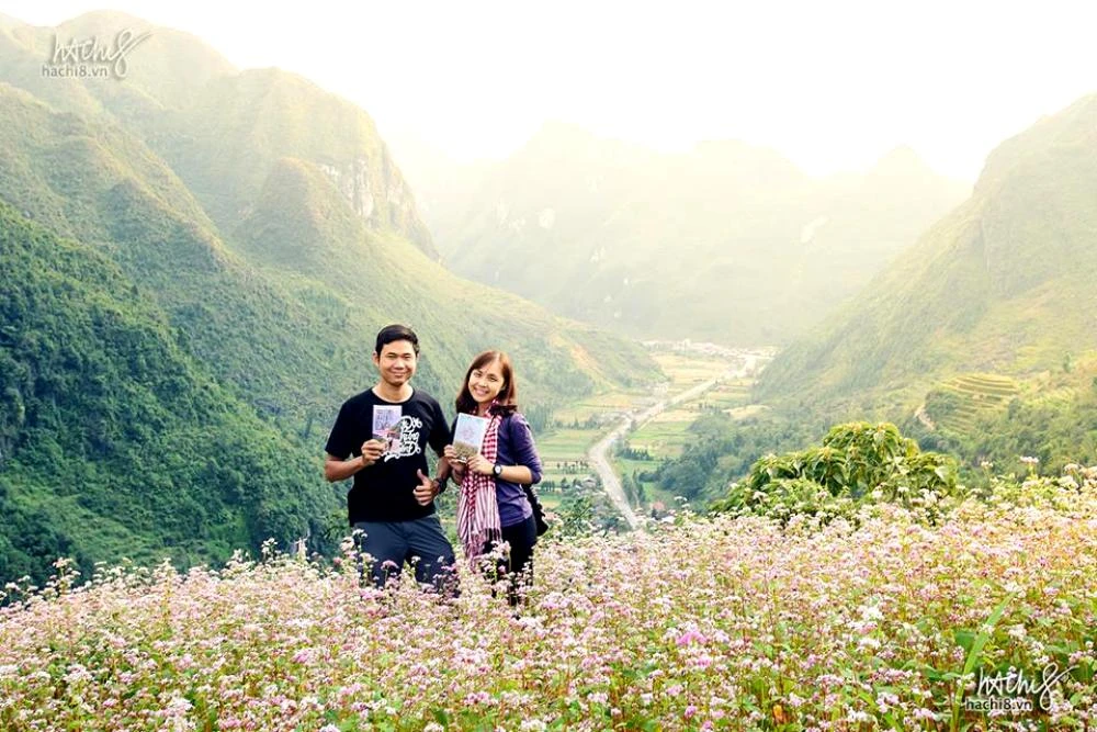 Hòa và My trên một vùng đất ở miền cao. Trên tay họ là cuốn sách mới của Hạnh My mang tên "Hẹn nhau mùa tam giác mạch".