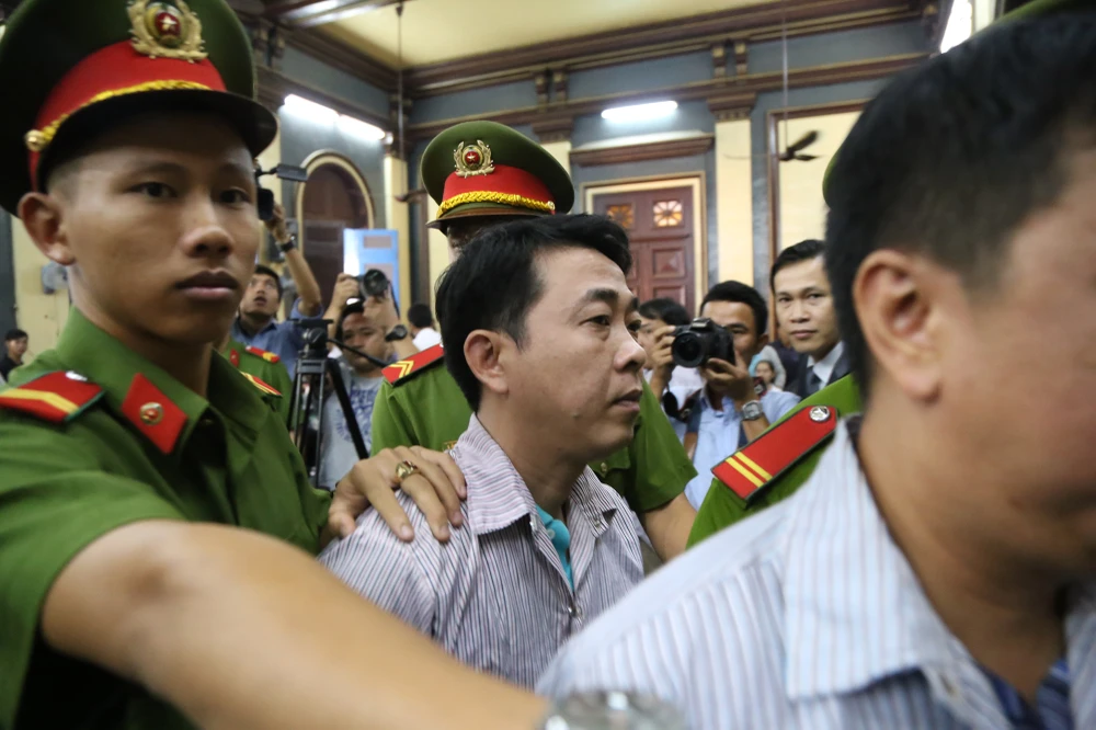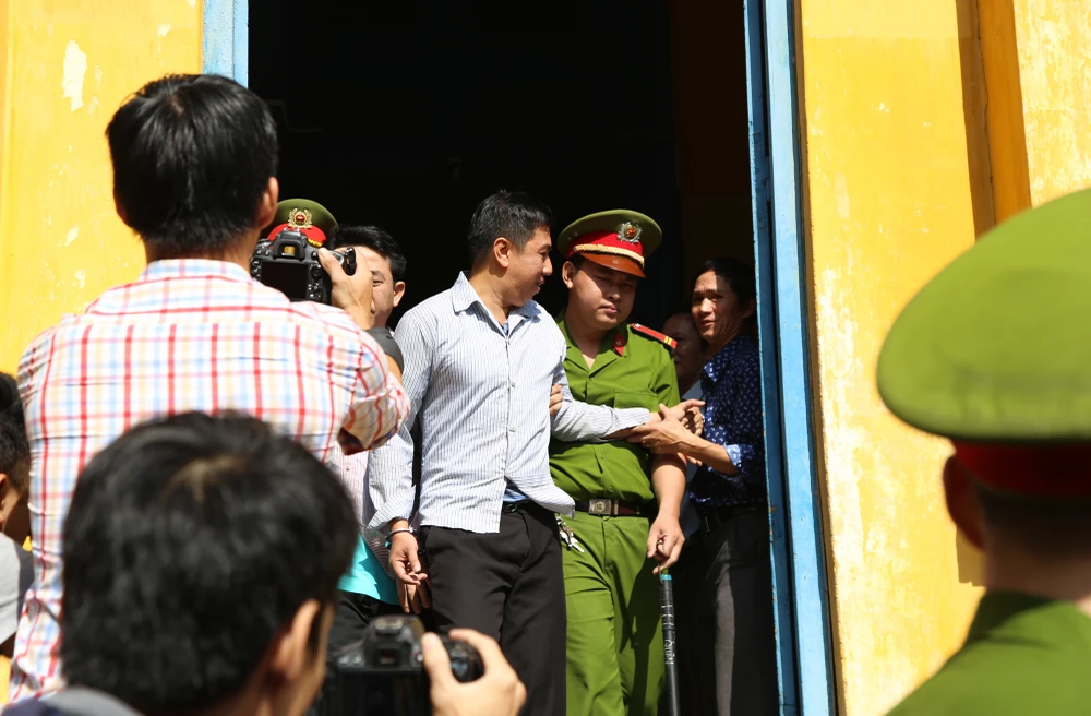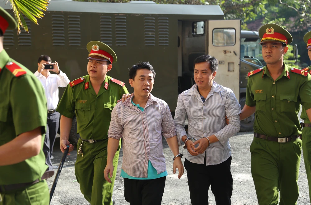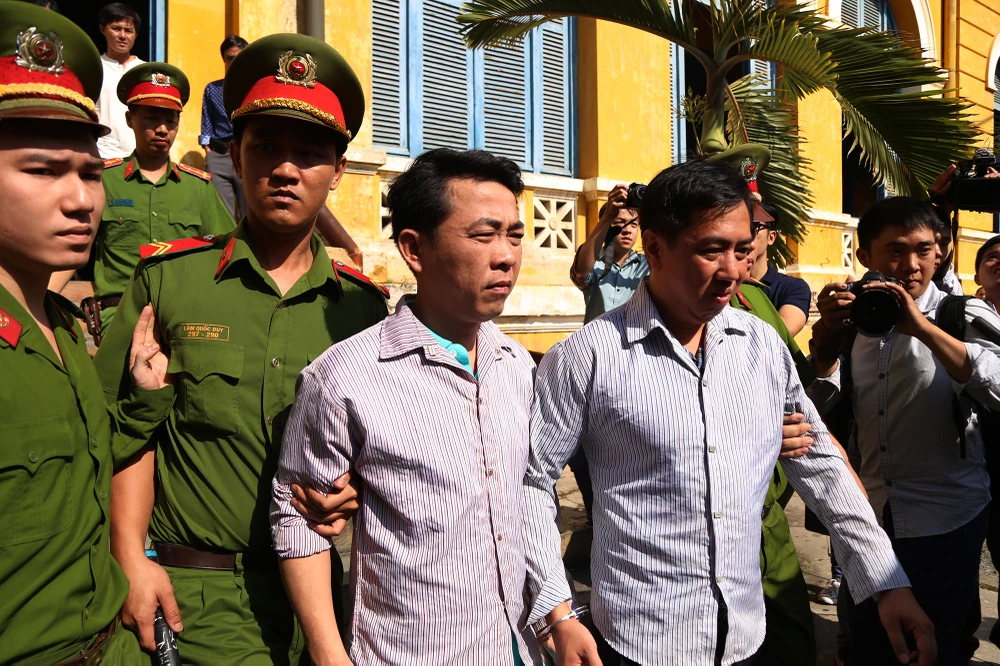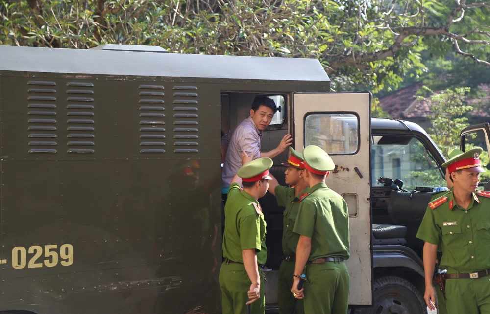 Hai bị cáo bị dẫn giải ra xe về trại giam.