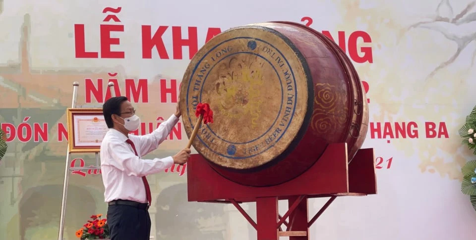 Ông Phan Văn Mãi, Chủ tịch UBND TP.HCM đánh trống khai giảng năm học mới. Ảnh: HTV9