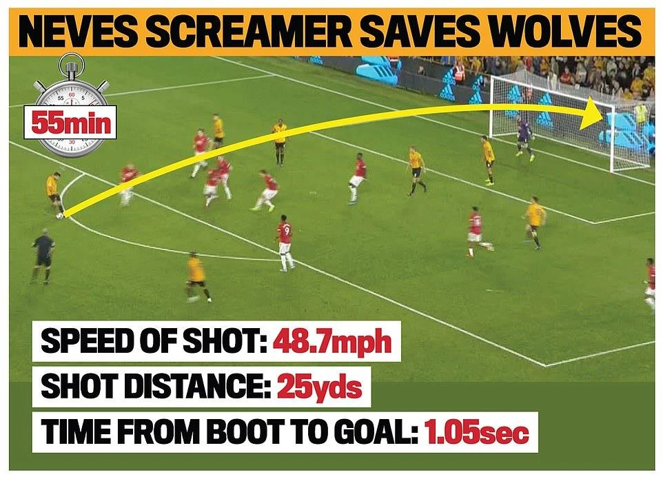 Tuy nhiên, ngay sau đó, từ quả đá phạt góc, Wolverhampton đã có được điều mình muốn. Phút 55, từ quả đá phạt góc, Neves có pha dứt điểm từ xa tuyệt đẹp đưa bóng chạm mép trên xà ngang bật vào lưới, thủ môn De Gea dù đã bay người hết cỡ nhưng không thể cứu thua. Tỉ số bây giờ là 1-1.