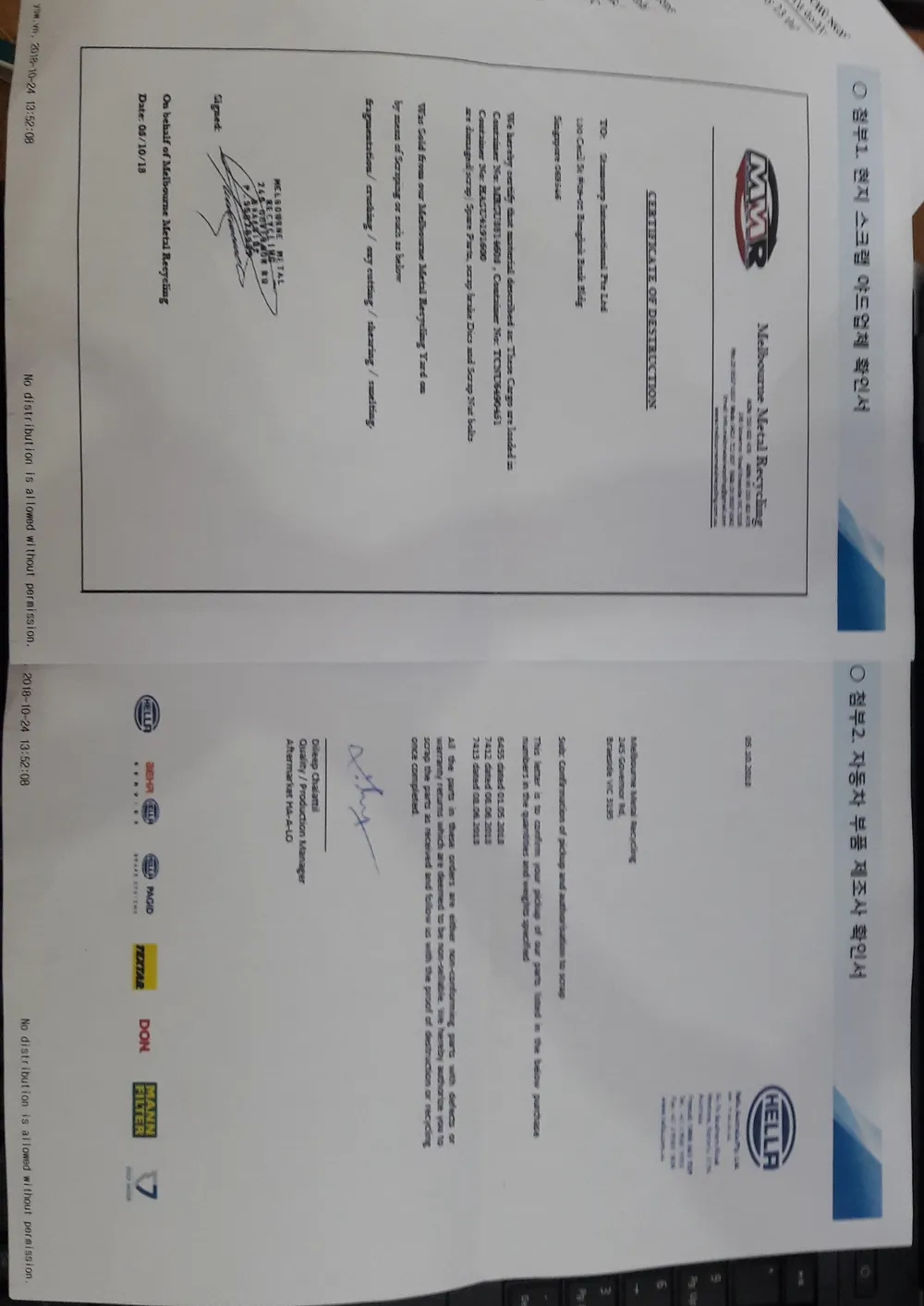 Giấy xác nhận phụ tùng ô tô là phế liệu từ đơn vị sản xuất, bán hàng cho Posco SS Vina.
