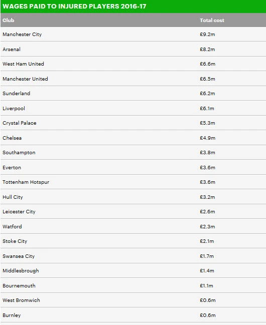Man City là CLB chịu nhiều thiệt hại nhất cả về nhân lực lẫn tiền bạc với 9,2 triệu bảng Anh chi tiền lương cho các cầu thủ ăn không ngồi rồi vì chấn thương. Đội của Pep Guardiola chịu 17 ca chấn thương từ tháng 7 năm ngoái đến nay, trung bình thiệt hại là 541.000 bảng Anh cho mỗi ca chấn thương.