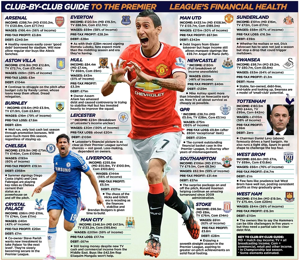 Bảng thống kê chi tiết của tờ Sports Mail (Anh) đã chỉ ra chính xác tình hình tài chính "bết bát" của 20 CLB tại Premier League. Bảng thống kê cho thấy, mặc dù Premier League là giải đấu thu hút nhiều tiền tài trợ nhất thế giới nhưng các cầu lạc bộ thi đấu tại đây cũng thuộc dạng nợ nhiều nhất thế giới.