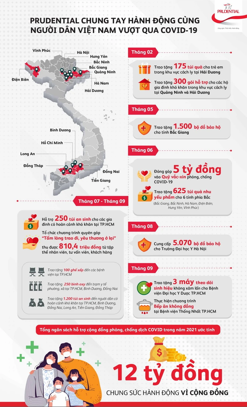 Từ đầu năm 2021 đến nay, Prudential ủng hộ 5 tỷ đồng vào Quỹ Vắc xin phòng COVID-19 của Chính phủ và hỗ trợ gần 3 tỷ đồng cho các hoạt động tại 15 tỉnh thành. Riêng trong quý IV-2021, Prudential tiếp tục phối hợp cùng Công ty TNHH Quản lý Quỹ Eastspring Investments (Eastspring Việt Nam) để thực hiện thêm các hoạt động cứu trợ thiết thực khác với ngân sách ước tính 4 tỷ đồng. Như vậy, ước tính các khoản đóng góp, hỗ trợ cộng đồng liên quan đến COVID-19 của Prudential trong năm 2021 tính đến tháng 9 đạt gần 12 tỷ đồng.