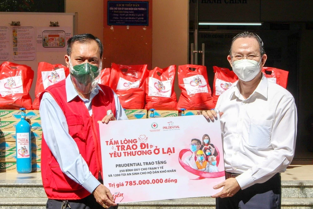 Cũng trong tháng 7 vừa qua, Prudential đã vận động các khách hàng, tập thể nhân viên, tư Vấn Viên và Giám đốc Văn phòng Tổng Đại lý hảo tâm ủng hộ cho chương trình “Tấm lòng trao đi – Yêu thương ở lại” hơn 810 triệu đồng. Nhờ đó, Chương trình đã trao tặng 100 ghế xếp cho các cơ sở y tế tại TP.HCM, 250 bình oxy đến các trạm y tế và 1.200 túi an sinh đến các hộ dân có hoàn cảnh khó khăn ở TP.HCM và 5 tỉnh thành phía Nam.