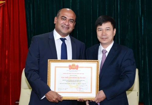 Tổng Giám đốc Prudential Finance (trái) nhận danh hiệu “Tập thể lao động xuất sắc” từ đại diện của Ngân hàng Nhà nước. Ảnh: MINH TUẤN