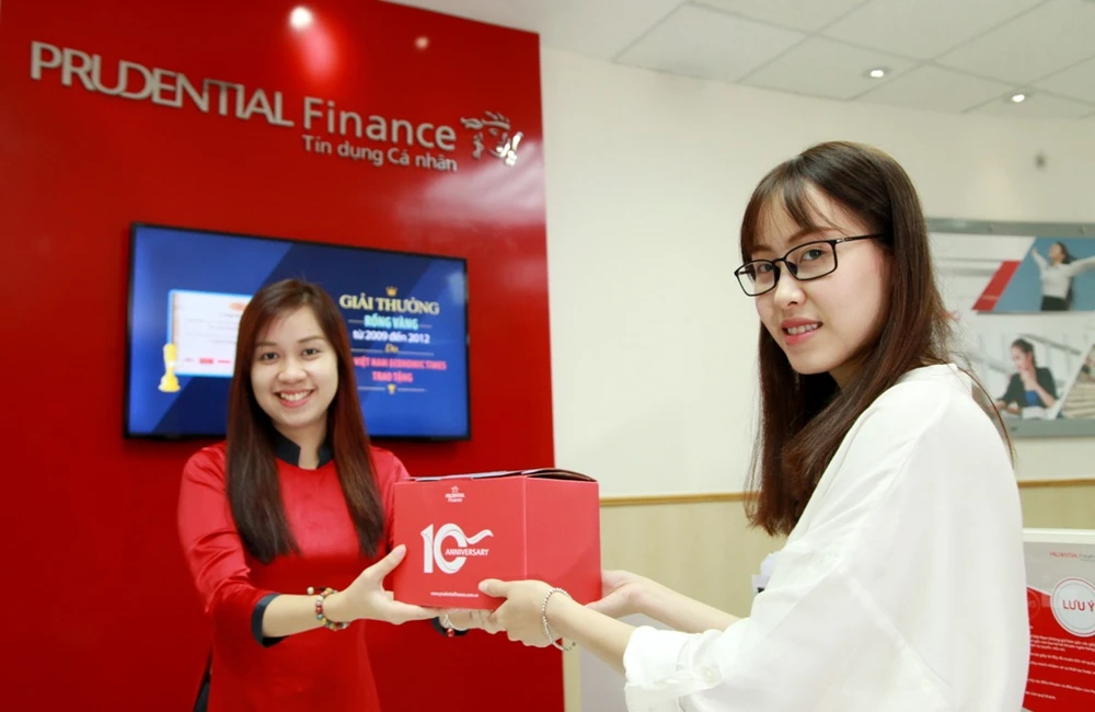 Một khách hàng có khoản vay tín chấp mới đón nhận quà tặng đặc biệt từ Công ty Tài chính Prudential Việt Nam nhân sự kiện kỷ niệm 10 năm ngày thành lập. Ảnh: BẢO THỊNH