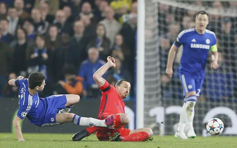 Sau tấm thẻ đỏ không đáng từ Ibra, đội hình của PSG buộc phải thay đổi lối chơi, chuyển sang phòng ngự nhưng họ vẫn không quên chăm lo tấn công. Còn về phần Chelsea, do nắm giữ quá nhiều lợi thế nên đội bóng này không quá mải mê dâng lên tấn công. Thế nên kể từ phút 31 trở về sau, trận đấu dần chậm lại trong thế trận giằng co đến từ cả 2. Những Hazard, Fabregas hay Diego Costa đều vấp phải một hàng thủ được tổ chức tốt, cùng một tinh thần chưa bao giờ lung lạc của các chàng trai nước Pháp. Hiệp 1 khép lại với không có bất kỳ bàn thắng nào được ghi.