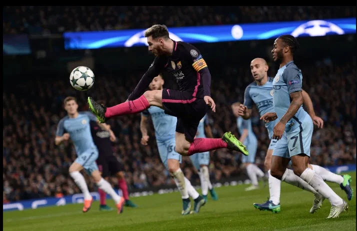 Messi trong màu áo Barca đối đầu với Man City. ẢNH: THE SUN