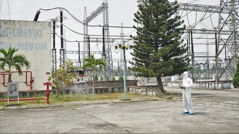 PTC2 sử dụng thiết bị bay phun thuốc khử khuẩn phòng chống dịch COVID-19 tại TBA 500 kV Đà Nẵng. Ảnh: PTC2