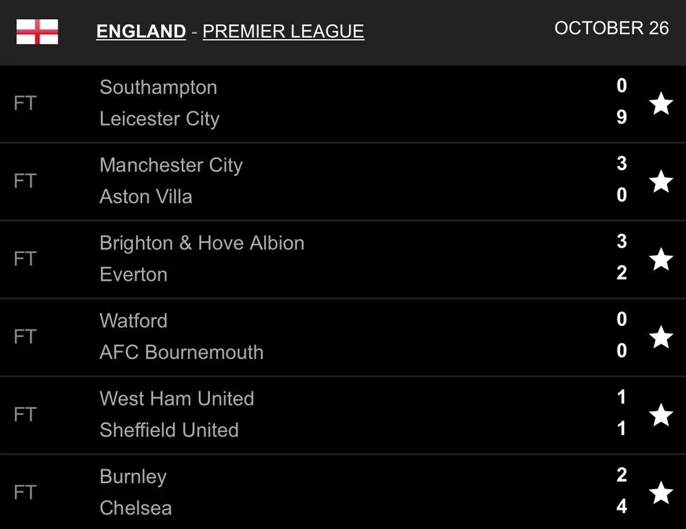 Kết quả vòng 10 Premier League: