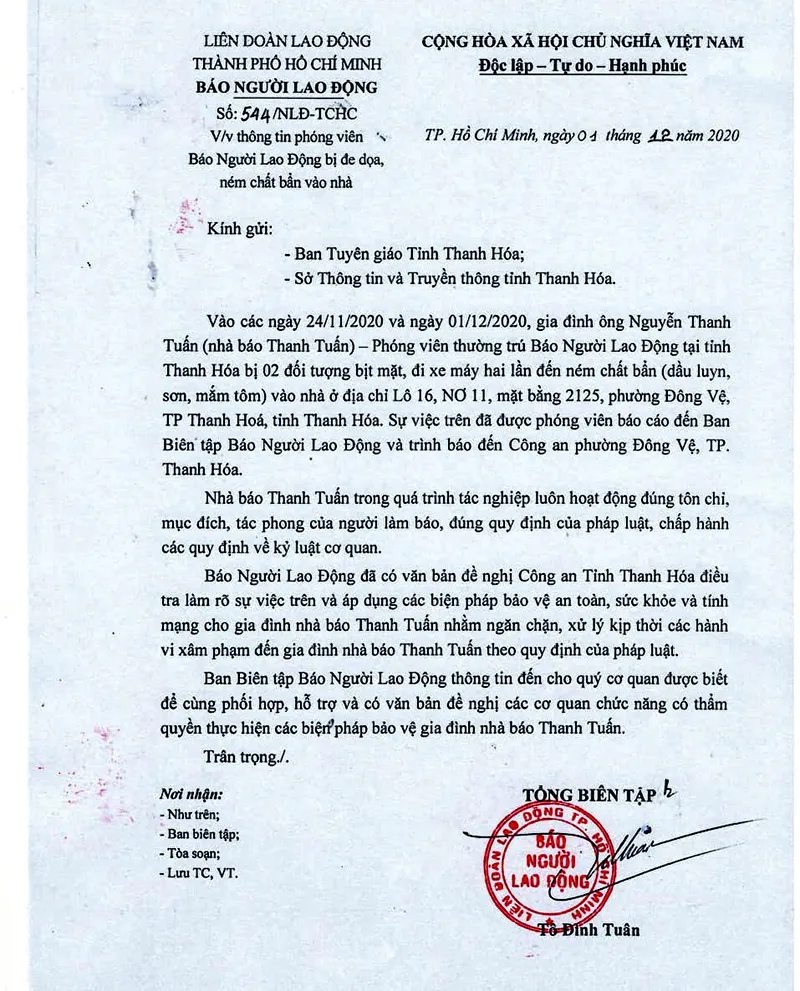 Ngay sau khi xảy ra sự việc, Tổng Biên tập báo Người Lao Động có văn bản gửi đến cơ quan chức năng tỉnh Thanh Hóa đề nghị thực hiện các biện pháp bảo vệ gia đình nhà báo Nguyễn Thanh Tuấn. Ảnh: Đ.TRUNG