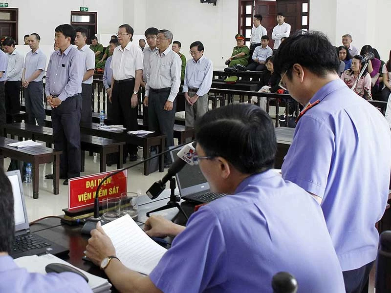 Các bị cáo nghe đại diện Viện Kiểm sát nêu quan điểm tổng hợp phiên xét hỏi tại phiên tòa. Ảnh: TTXVN