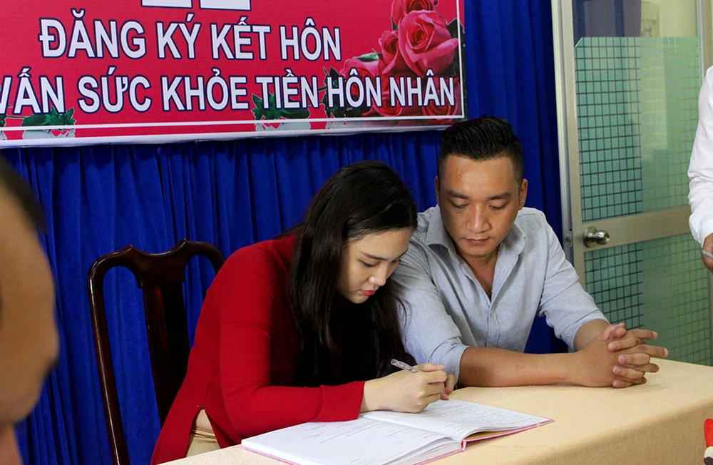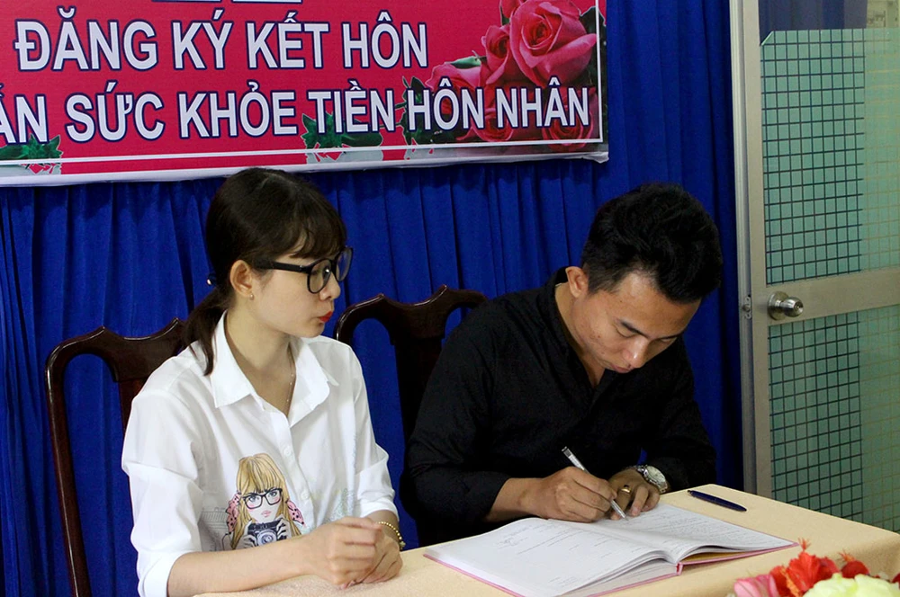 Cặp đôi Nguyễn Huỳnh Diệu Lan - Lâm Đình Tùng ký vào giấy đăng ký kết hôn. Ảnh: LÊ THOA