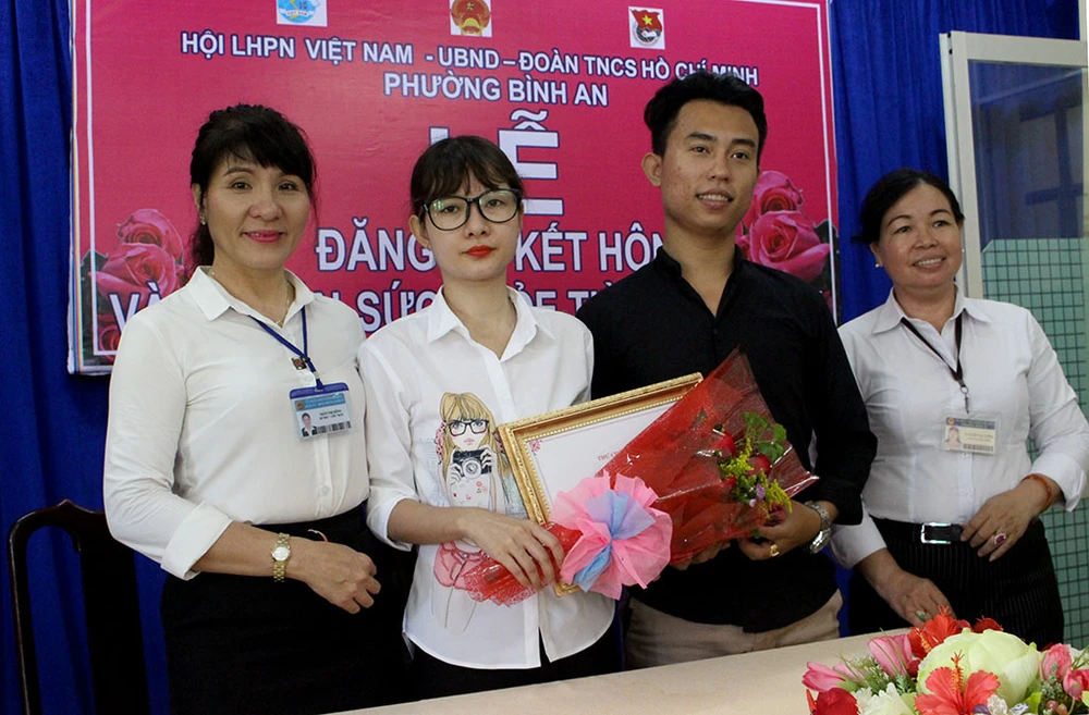 Bà Trần Thị Hồng – Bí thư Đảng ủy kiêm Chủ tịch HĐND phường Bình An (bìa trái) chúc mừng cặp đôi: Nguyễn Phương Duy – Trần Thị Đào Mộng. Ảnh: LÊ THOA