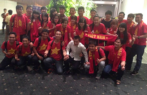 Thành Lương (áo trắng) chụp ảnh lưu niệm cùng cổ động viên lại lễ trao giải Fair Play báo Pháp Luật TP.HCM. Ảnh: PHẠM QUANG HÀ.