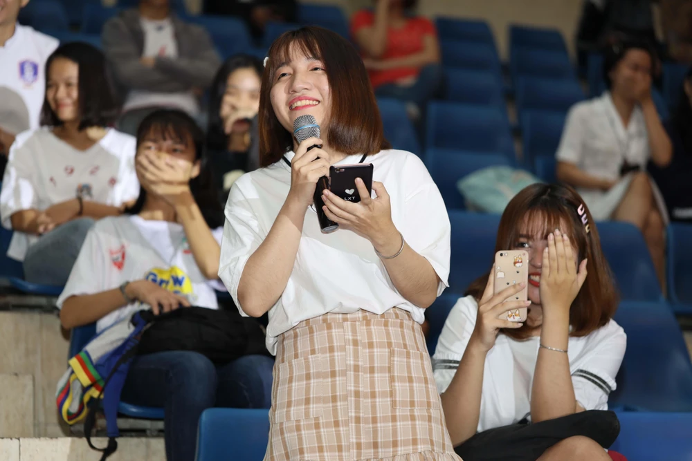 Các bạn trẻ phấn khích hỏi cầu thủ về chế độ dinh dưỡng.