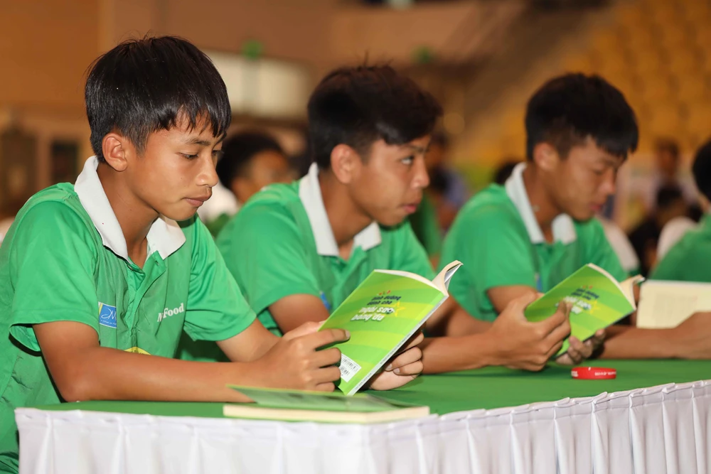 Những cầu thủ nhí của Học viện bóng đá NutiFood đang xem sách.