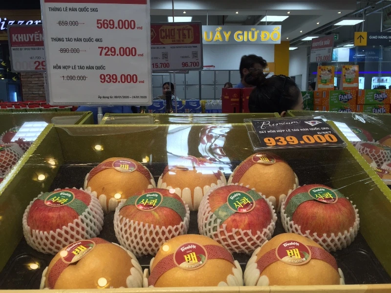 Trong khi đó, tại siêu thị Emart những hộp quà trái cây giá khủng thu hút sự quan tâm của người tiêu dùng. Chẳng hạn hộp gồm 10 trái táo, lê Hàn Quốc giá 939.000 đồng/hộp hay hộp 10 trái táo Hàn Quốc 729.000 đồng/hộp. Hay sâm Hàn Quốc giá 2.990.000 đồng/kg và được đóng thành từng củ trọng lượng 0,084gr giá 251.000 đồng/củ…