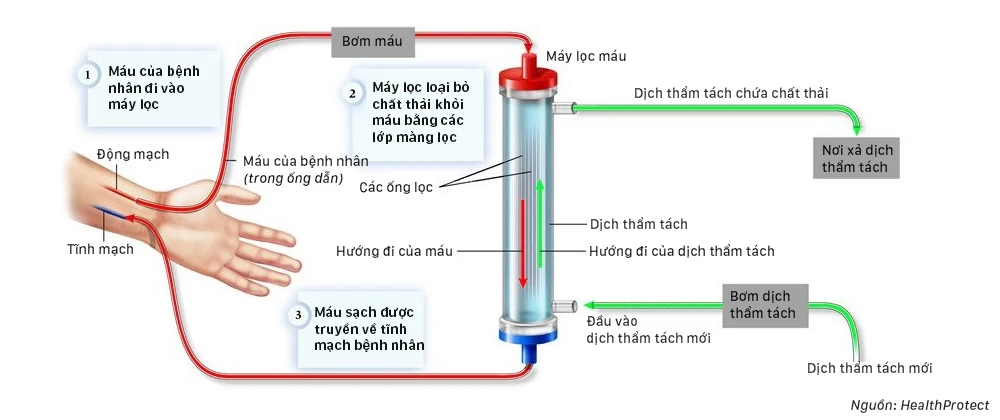 "Chạy thận" là quá trình lọc bỏ chất thải khỏi máu bệnh nhân thông qua thiết bị thẩm tách, sau đó bơm máu sạch trở lại cơ thể, áp dụng với các bệnh nhân có bệnh về thận.