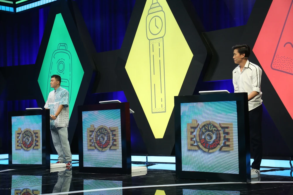 Quách Ngọc Tuyên hài hước rinh "tủ" của chương trình bỏ sau lưng đàn anh khiến cả trường quay bật cười.